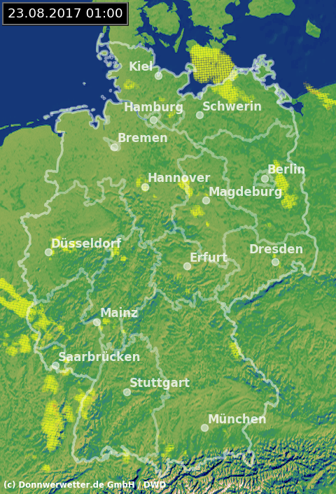 Das Radarbild zeigt momentan zwar schwache Signale, diese deuten aber nicht auf Niederschläge. Der Himmel über Deutschland ist im Südwesten teils bewölkt, sonst überwiegend sternenklar. Stellenweise haben sich einige Nebelfelder gebildet.