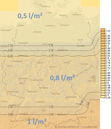 Heute und am Freitag muss in der Südosthälfte gebietsweise mit kräftigen Regenfällen und örtlichen Gewittern gerechnet werden. Stellenweise können zwischen 25 und 50 Liter Niederschlag pro Quadratmeter fallen. Sonst regnet es nur teilweise etwas, oder es treten lokale Schauer auf.