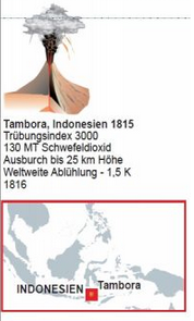 Erst gut 100 Jahre später, nämlich 1920, bracht der Klimaforscher William Jackson Humphreys das extreme Wetterjahr 1816 mit dem Ausbruch des Tambora im Jahr 1815 in Verbindung. Sein Ausbruch schleuderte damals 150 km³ Staub, dazu auch in hohen Mengen Asche und Schwefelverbindungen, in die Atmosphäre.