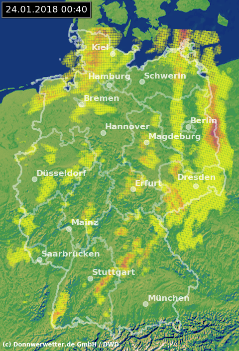 Das Radarbild zeigt aktuell vor allem im Norden und in der Mitte Signale mit leichtem Regen oder Sprühregen. Sonst ist der Himmel über Deutschlands überwiegend wolkenverhangen, nur ganz im Süden, sowie in der Lausitz zeigen sich die Sterne.