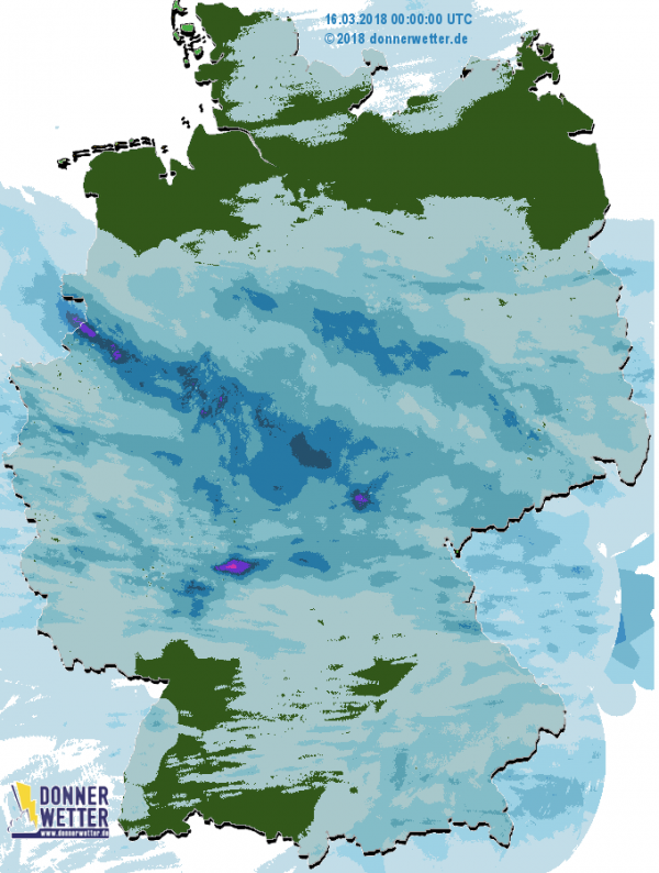 Das Radarbild zeigt aktuell gebietsweise leichte bis mäßige Signale mit vorwiegend Schnee. Sonst ist der Himmel über Deutschland überwiegend wolkenverhangen, aber vor allem im Südwesten häufig auch noch sternenklar. Stellenweise haben sich Nebelfelder gebildet.