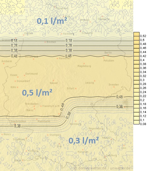 Am Mittwoch erreicht uns von Westen ein weiteres Niederschlagsgebiet mit Mengen zwischen 5 und 20 Liter pro Quadratmeter.
