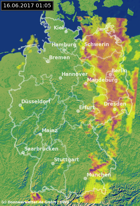 Das Radarbild zeigt aktuell im Osten noch stärkere Niederschlagssignale. Örtlich blitzt und donnert es hier auch noch. Sonst hat es von Westen teilweise wieder aufgeklart.