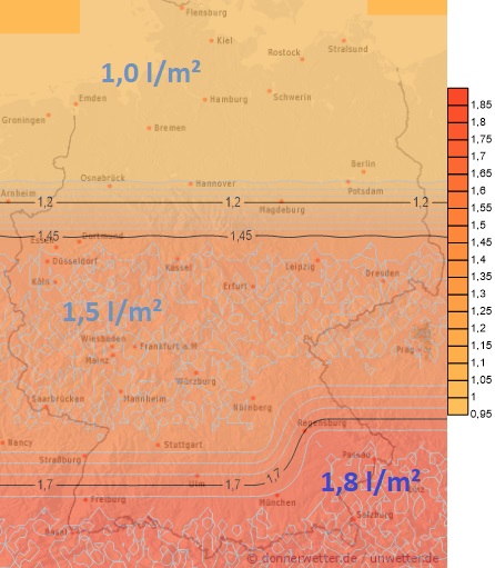 Bis Freitag fällt gebietsweise Regen oder es gehen örtlich kräftige Schauer und Gewitter nieder. Die Niederschlagsmengen liegen pro Tag zum Teil zwischen 5 und 20 Liter pro Quadratmeter. Regional bleibt es aber auch trocken.