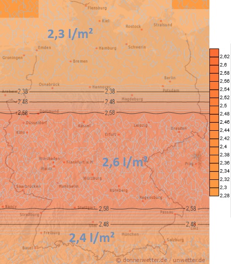 Heute fällt vor allem in der Südosthälfte unseres Landes Regen, sonst bilden sich nur örtliche Schauer und einzelne Gewitter. Die Niederschlagsmengen liegen meist zwischen 5 und 20 Liter pro Quadratmeter, vereinzelt auch mehr.