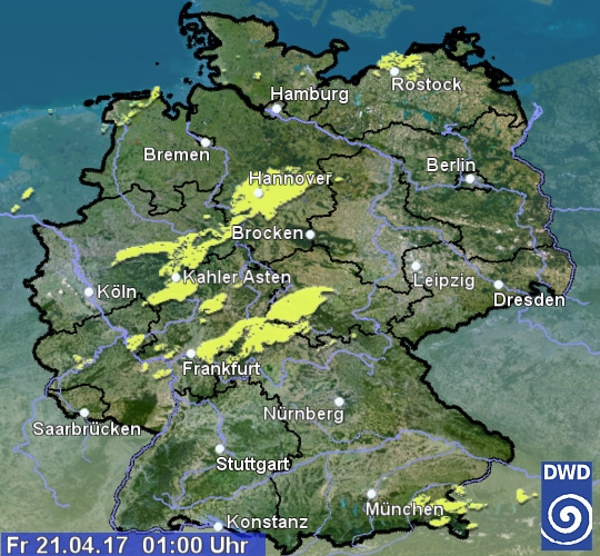 Das Radarbild zeigt aktuell einige leichte Niederschlagssignale an. Es handelt sich hierbei jedoch um mittelhohe Wolken, aus denen zwar etwas Niederschlag fällt, dieser jedoch nicht den Boden erreicht. Lediglich aus den schwachen Echos an der österreichischen Grenze könnten noch einige Schneeflocken segeln.