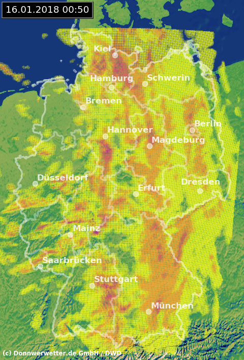 Das Radarbild zeigt aktuell vor allem in der Mitte und im Osten ausgedehnte Signale mit Regen und zum Teil auch Schnee, im Westen gibt es trockene Pausen. Sonst ist der Himmel über Deutschlands meistens wolkenverhangen und nur selten zeigen sich einige Sterne. Der Wind ist gebietsweise lebhaft.