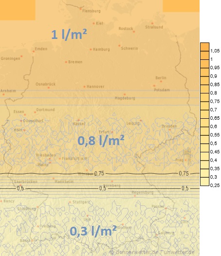 Von Samstag bis Sonntag zieht mit auffrischendem Wind ein neues Regengebiet von Nordwesten über Deutschland hinweg. Dabei können verbreitet wieder zwischen 10 und 20 Liter Regen pro Quadratmeter fallen, örtlich auch mehr.