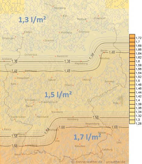 Am Donnerstag regnet es wieder vermehrt, oder es treten Schauer auf. Die Niederschlagsmengen liegen meistens zwischen 1 und 15 Liter pro Quadratmeter.