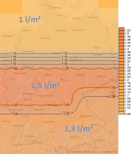 Heute treten vor allem in der Landesmitte teils gewittrige Schauer auf mit Niederschlagsmengen zwischen 1 und 10 Liter pro Quadratmeter auf. Sonst bleibt es überwiegend trocken und tagsüber relativ warm.