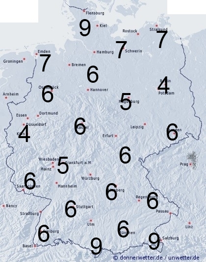 Im Küstenbereich von Nord- und Ostsee, über Schleswig-Holstein, sowie im Süden kann es gebietsweise etwas regnen. Sonst entsteht leichte Benetzung durch nächtlichen Strahlungstau. Die Benetzungsdauer liegt in Deutschland allgemein zwischen 4 und 9 Stunden.
