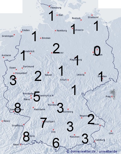 Im Südwesten kommen tagsüber teils kräftige Gewittergüsse auf. Die Benetzungsdauer erreicht hier in der Regel zwischen 2 und 8 Stunden. Sonst entsteht leichte Benetzung nur durch nächtlichen Strahlungstau.