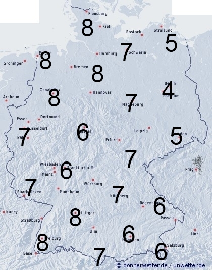Eine Störungsfront zieht von Westen über Deutschland hinweg und löst teilweise kräftige gewittrige Schauer aus. Sonst entsteht leichte Benetzung durch nächtlichen Strahlungstau. Die Benetzungsdauer liegt allgemein zwischen 4 und 9 Stunden.