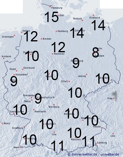Im Norden fällt gebietsweise leichter Regen. Sonst entsteht Benetzung durch Nebelnässe und Tau. Die Benetzungsdauer liegt in Deutschland allgemein zwischen 8 und 11 Stunden, im Norden kann sie bei Regen auf 12 bis 15 Stunden steigen, außerhalb von Ortschaften können in geschützten Lagen durchaus noch höhere Werte erreicht werden.