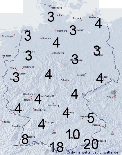Die Regengüsse ziehen sich an die Alpen zurück. Sonst treten nur im Nordosten örtliche Schauer auf. Leichte Benetzung entstehe auch durch nächtlichen Strahlungstau. Die Benetzungsdauer liegt in Deutschland allgemein zwischen 3 und 5 Stunden, südlich der Donau zwischen 5 und 12 Stunden. Direkt an den Alpen können 13 bis 20 Stunden erreicht werden.