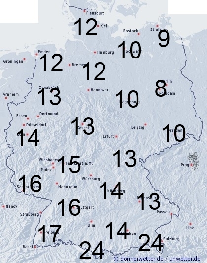 Von Südwest nach Nordost zieht ein weiteres Niederschlagsgebiet über Deutschland. Dabei fällt zunächst Schnee, später teilweise Regen. Sonst entsteht Benetzung durch Feuchtigkeit, wie Tau- oder Reifansatz. Die Benetzungsdauer liegt allgemein zwischen 8 und 11 Stunden im Nordosten, sowie 12 bis 17 Stunden im übrigen Land. Bei einer Schneedecke können bis zu 24 Stunden erreicht werden.