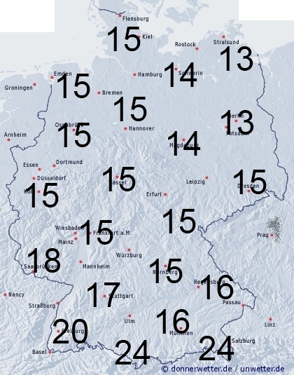 In Deutschland fallen verbreitet Niederschläge im Südwesten meist als Regen, sonst teils Regen, teils Schnee. Die Benetzungsdauer liegt allgemein zwischen 13 und 20 Stunden, wobei die niedrigsten Werte im Nordosten und die höchsten Werte im Südwesten anzutreffen sind. Bei einer vorhandenen Schneedecke können jedoch bis zu 24 Stunden erreicht werden.