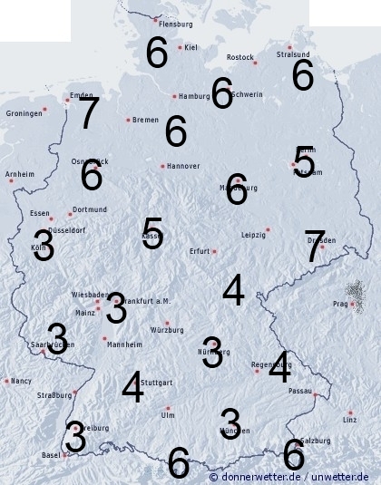 Im Norden und Nordosten treten örtliche Regengüsse auf. Sonst entsteht leichte Benetzung durch nächtlichen Strahlungstau. Die Benetzungsdauer liegt allgemein zwischen 3 und 5 Stunden, im Norden und an den Alpen können zwischen 5 und 7 Stunden erreicht werden.