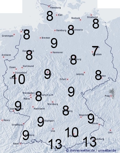 Im Süden und Westen können im Tagesverlauf einzelne teils gewittrige Regenschauer aufziehen. Sonst entsteht Benetzung durch nächtlichen Strahlungstau. Die Benetzungsdauer liegt in Deutschland allgemein zwischen 7 und 13 Stunden.