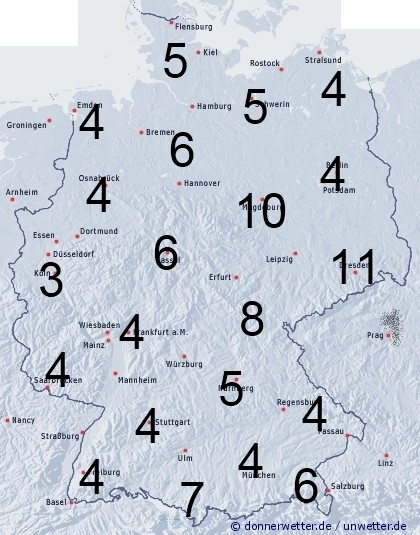 Vor allem über Sachsen, Sachsen-Anhalt, sowie Thüringen fällt zeitweise Regen mit einer Benetzungsdauer zwischen 8 und 11 Stunden. Im Alpenvorland treten örtliche Schauer auf mit einer Benetzungszeit zwischen 4 und 7 Stunden. Sonst entsteht Benetzung durch nächtlichen Strahlungstau.