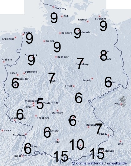 Im Norden treten Schauer auf, südlich der Donau fällt zeitweise Regen. Dazwischen bleibt es überwiegend niederschlagsfrei. Leichte Benetzung entsteht jedoch auch durch nächtlichen Strahlungstau. Die Benetzungsdauer liegt allgemein zwischen 5 und 7 Stunden, im Norden zwischen 7 und 10 und südlich der Donau werden 10 bis 15 Stunden erreicht.