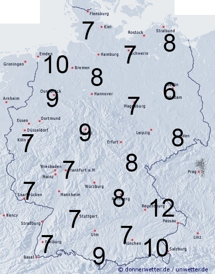 Im Nordwesten, über den Mittelgebirgen und an den Alpen kann es noch zu Schauern kommen, die in höheren Lagen auch als Schnee fallen können. Sonst entsteht Benetzung durch Tau oder auch Reif. Die Benetzungsdauer liegt allgemein zwischen 6 und 12 Stunden, kann jedoch außerhalb von Ortschaften in geschützten Lagen noch deutlich nach oben abweichen.