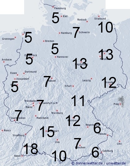 In einem Streifen vom Schwarzwald bis zur Oder regnete es für längere Zeit. Sonst entsteht Benetzung durch Feuchtigkeit wie Tauansatz. Die Benetzungsdauer liegt in der über Deutschland liegenden Regenzone zwischen 8 und 18 Stunden, sonst zwischen 4 und 7 Stunden. Bei einer vorhandenen Schneedecke in den Bergen können bis zu 24 Stunden erreicht werden.