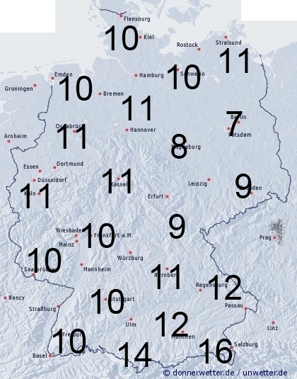 Bei einem böigem Westwind treten in Deutschland gelegentliche Regenfälle oder Schauer auf. Die Benetzungsdauer liegt dabei allgemein zwischen 7 und 12 Stunden, an den Alpen auch darüber.