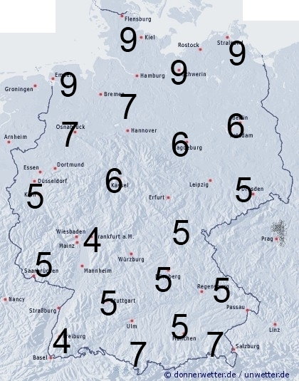 Eine vorläufig letzte Front bringt dem Norden und teilweise auch noch den mittleren Landesteilen Regen oder Schauer. Sonst entsteht Benetzung durch nächtlichen Tau. Die Benetzungsdauer liegt allgemein zwischen 4 und 9 Stunden, kann aber außerhalb von Ortschaften deutlich nach oben abweichen.