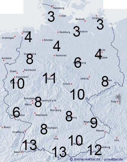 In Deutschland fällt gebietsweise Regen, oder es kommt zu Schauern und örtlichen Gewittern. Sonst entsteht Benetzung durch nächtlichen Strahlungstau, im Norden weniger, im Süden mehr. Die Benetzungsdauer liegt im Norden zwischen 3 und 6 Stunden, sonst zwischen 6 und 13 Stunden.