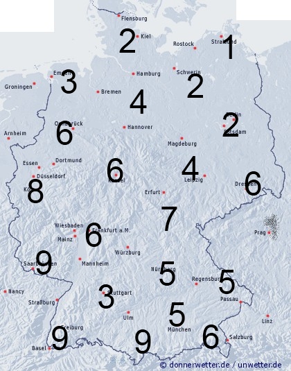 Ein Regengebiet zieht von West nach Ost über Deutschland hinweg und sorgt für Benetzung von 3 bis 9 Stunden. Lediglich im Norden und Nordosten bleibt es für längere Zeit trocken, daher ist hier die Benetzungszeit auch am niedrigsten.