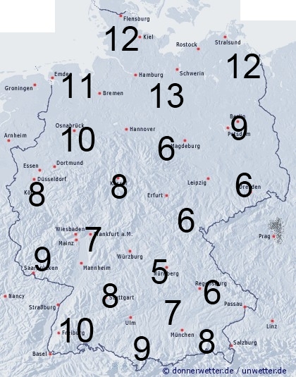 Teils kräftige Regenfälle und Schauer sorgen in Deutschland für eine erhöhte Benetzung von meist 5 bis 13 Stunden. Die höheren Werte findet man bei längerem Regen in Norddeutschland.