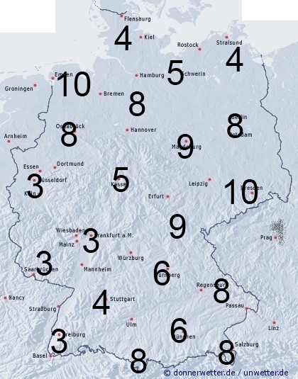 In Deutschland muss gebietsweise mit Regengüssen gerechnet werden. Niederschlagsfrei bleibt es im Südwesten, sowie in Teilen Schleswig - Holsteins und Mecklenburg - Vorpommerns. Sonst entsteht leichte Benetzung durch nächtlichen Strahlungstau. Die Benetzungsdauer liegt in den niederschlagsfreien Bereichen zwischen 2 und 4 Stunden, bei Schauern werden meist zwischen 4 und 10 Stunden erreicht.