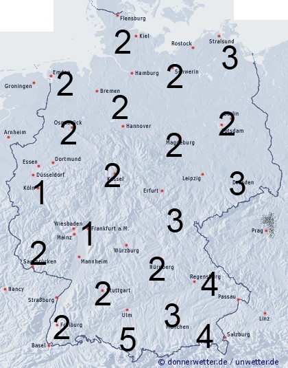 Im Süden und Osten sorgen noch örtliche Schauer und Gewittern für Benetzung. Sonst entsteht leichte Benetzung durch nächtlichen Strahlungstau. Die Benetzungsdauer liegt in Deutschland meist zwischen 1 und 5 Stunden.