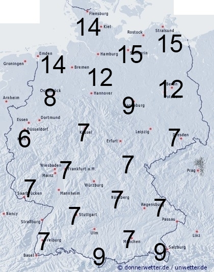 Im Norden fällt noch zeitweise Regen, oder es kommt zu Schauern. Sonst entsteht Benetzung durch nächtlichen Strahlungstau. Die Benetzungsdauer liegt im Norden zwischen 9 und 15 Stunden, sonst werden nur 6 bis 9 Stunden erreicht.