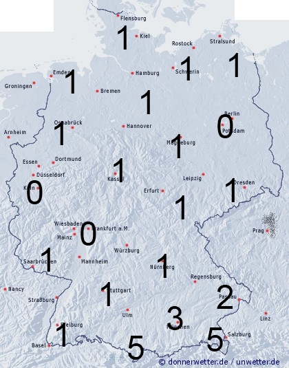 Im südlichen Baden-Württemberg und Bayern können Regengüsse mit einer Benetzungszeit zwischen 2 und 5 Stunden auftreten. Im übrigen Land entsteht nur leichte Benetzung durch nächtlichen Strahlungstau.