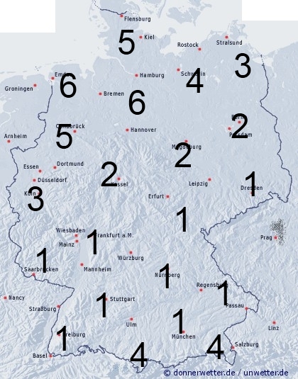 Vor allem im Nordwesten und Norden kann es gebietsweise regnen, oder zu Schauer kommen. Auch direkt an den Alpen drohen einige Regengüsse. Die Benetzungsdauer erreicht dabei meist zwischen 2 und 6 Stunden. Sonst ist es überwiegend niederschlagsfrei. Leichte Benetzung entsteht nur durch nächtlichen Strahlungstau.