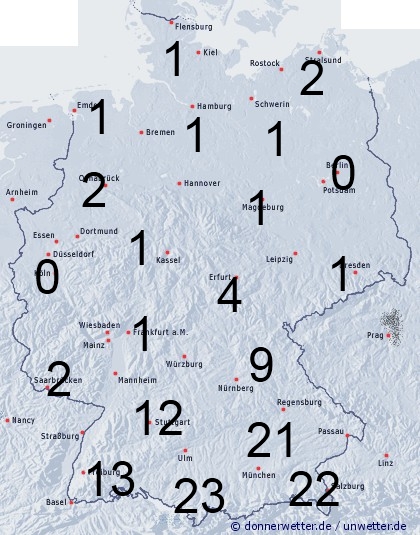 Südlich der Donau kommt es bei Dauerniederschlag zu einer hohen Benetzung von teilweise über 20 Stunden. Nach Norden nimmt die Benetzung spürbar ab. Durch örtliche Schauer entsteht meist nur leichte Benetzung.
