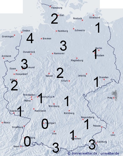 In der Nordwesthälfte können bei auftretenden Schauern zwischen 2 und 4 Stunden Benetzung erreicht werden. Sonst entsteht nur durch nächtlichen Strahlungstau leichte Benetzung.