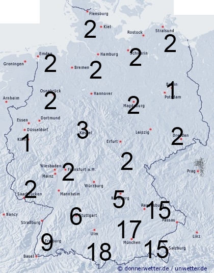 Südlich der Donau fällt gebietsweise länger andauernder und zum Teil ergiebiger Regen. Die Benetzungsdauer liegt hier oft zwischen 10 und 18 Stunden. Sonst werden im Süden meist zwischen 5 und 10 Stunden erreicht. In den übrigen Landesteilen treten nur örtliche Schauer auf mit einer Benetzungszeit zwischen 1 und 4 Stunden.