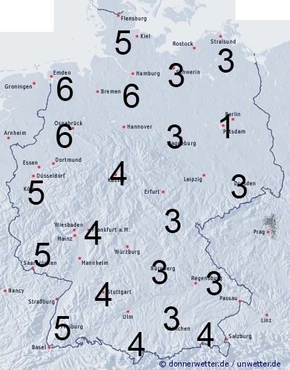 In der Westhälfte ziehen im Tagesverlauf Regengüsse und Gewitter auf. Die Benetzungsdauer erreicht hier meist zwischen 4 und 6 Stunden. Sonst entsteht Benetzung von 1 bis 4 Stunden durch nächtlichen Strahlungstau.