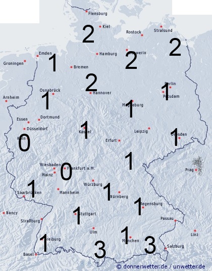 Vor allem im Norden, Nordosten, sowie am Alpenrand treten einzelne Schauer, oder Gewitter mit einer Benetzungszeit zwischen 1 und 3 Stunden auf. Sonst entsteht leichte Benetzung nur durch nächtlichen Strahlungstau.