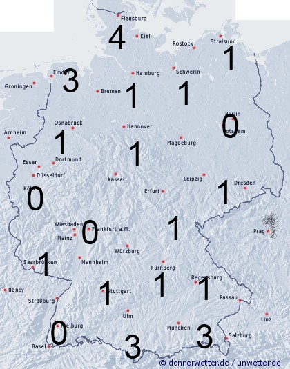 Im Nordwesten und in Schleswig-Holstein fällt gelegentlich leichter Warmfrontregen. Die Benetzungsdauer liegt hier zwischen 2 und 4 Stunden. Sonst bleibt es in der Regel trocken. Leichte Benetzung entsteht nur durch nächtlichen Strahlungstau.