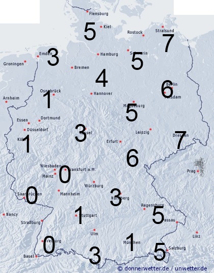 Die Benetzungsdauerkarte zeigt ein Nordost – Südwestgefälle, weil Regenschauer im Nordosten zahlreicher auftreten als anderswo. Im Südwesten bleibt es in der Regel sogar ganz trocken. Daher können von Rügen bis zum Erzgebirge durchaus 7 Stunden erreicht werden, während es im Südwesten kaum zu Benetzung kommt.