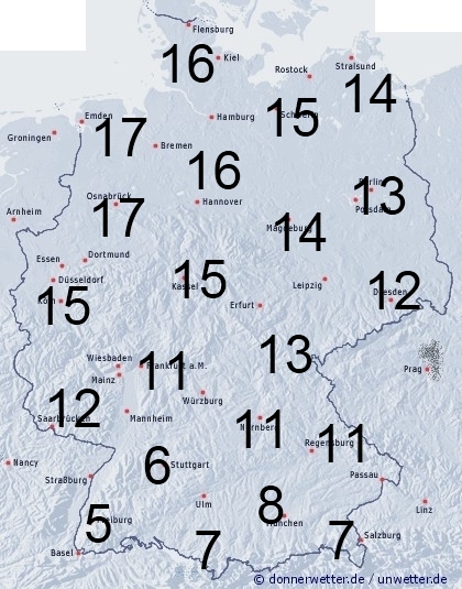 Bevor letzte Schauer sich aus Deutschland entfernen, zieht bereits von Nordwesten ein neues dickes Regenpaket ins Land. Die Benetzungsdauer ist vor allem im Norden und in der Mitte mit 12 bis 17 Stunden recht hoch. Im Süden dauert es länger bis der neue Regen herein zieht, daher liegt hier die Benetzungszeit auch nur zwischen 5 und 12 Stunden.