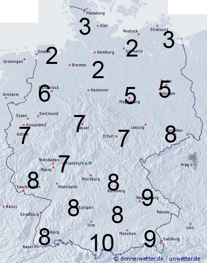 Die Benetzungsdauer liegt in großen Teilen Deutschlands meist zwischen 5 und 10 Stunden. Lediglich im Norden ist es noch längere Zeit trocken und Regen zieht erst zum Abend auf. Daher erreicht die Benetzungsdauer hier nur zwischen 2 und 4 Stunden.
