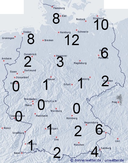 Im Norden fällt zeitweise Regen, daher ist hier die Benetzungsdauer mit 6 bis 12 Stunden auch am höchsten. Am Erzgebirge, dem Bayrischen-Wald und am Alpenrand können 2 bis 6 Stunden erreicht werden. Sonst treten Schauer nur vereinzelt auf und die Benetzung ist sehr niedrig.