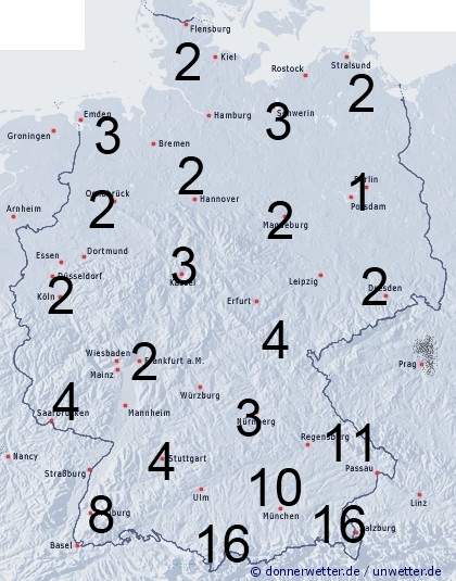 Vor allem im Alpenvorland regnet es für längere Zeit. Daher liegt die Benetzungsdauer im südlichen Bayern und im Bayrischen Wald 10 bis 16 Stunden. Auch im südlichen Baden-Württemberg können noch zwischen 8 und 12 Stunden erreicht werden. Sonst sorgen örtliche Schauer und nächtlicher Strahlungstau für eine Benetzung von 1 bis 5 Stunden.
