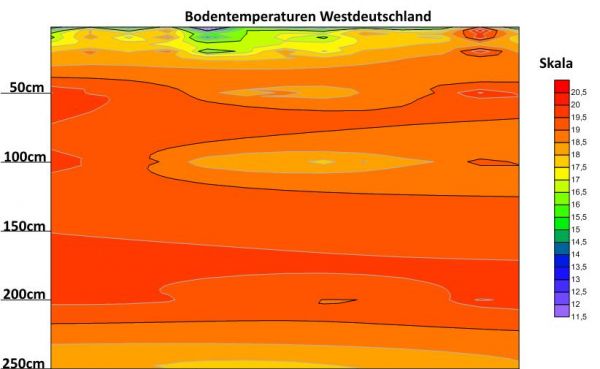Bodentemperaturen vom 01.08.2016 bis zum 30.08.2016, für den Westen Deutschlands.