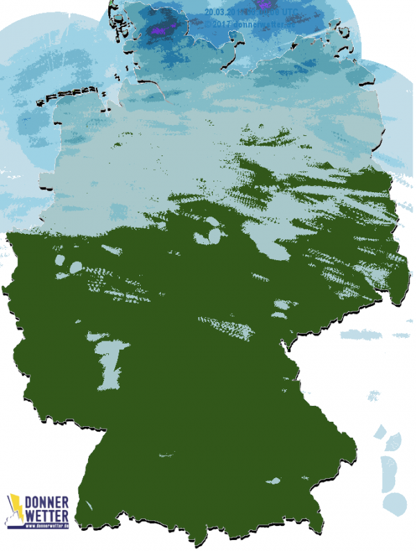 Das Radarbild zeigt das schmale Regenband der Kaltfront im Nordwesten mit teils kräftigen schauerartigen Regen. Diese Front wandert unter Aktivierung allmählich nach Südosten und wird etwa gegen Abend die Alpen erreichen. Dort bleibt sie stationär und sorgt für Dauerniederschläge, wobei die Schneefallgrenze wieder unterhalb von 1000 m sinken kann. Verbreitet fallen in Deutschland zwischen 2 und 10 Liter Niederschlag / m². In der Nacht auf Mittwoch und am Mittwoch sind im Alpenvorland zwischen 10 und 20 Liter Niederschlag / m² zu erwarten. Im Norden stellt sich Wetterberuhigung ein.